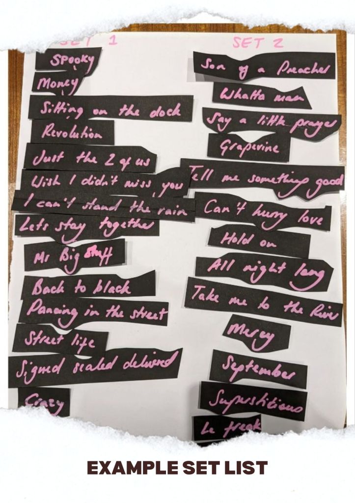 We have an extensive set list with plenty to get people up and dancing. With two lead vocalists, we can tackle a range of songs with harmonising backing vocals and tight arrangements. Feel free to let us know if you would like us to learn a song before an event.